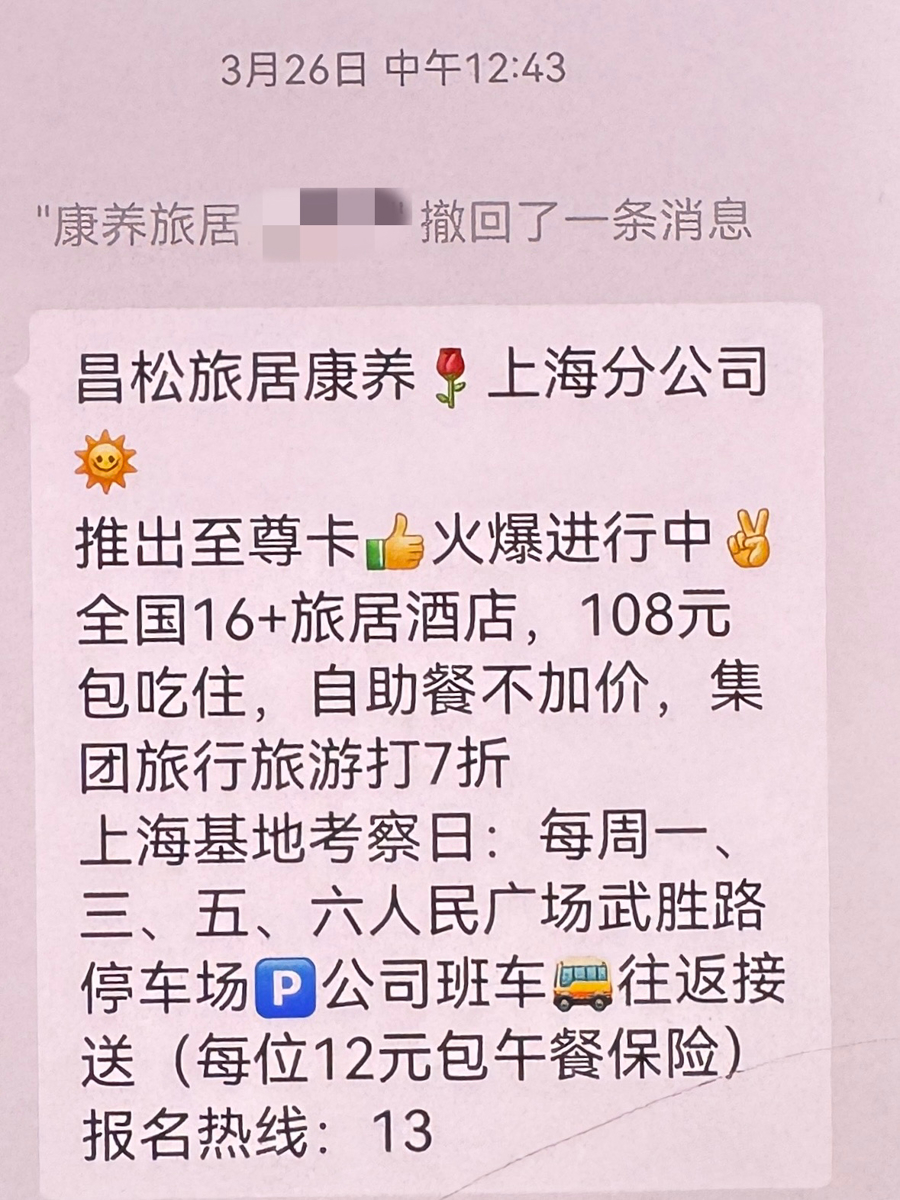 不久后,他的邻居介绍了一个姓史的业务员,称赞她服务好,很热心。史姓业务员与盛先生建立联系后,不提充卡,反而提到手中有几百个会员,每个月都会发车出去旅游,与盛先生有业务合作的空间。“这确实说到了我的心坎上。我想着旅居业务也是搞旅游的,如果能从中拿到返利,一举两得。”在随后近半年的时间里,史姓业务员时而发来出团旅行的视频,时而发来会员排队充值的盛况,还曾上门拜访慰问他,取得了盛先生的信任。2024年下半年,他终于答应了线下赴约,带着同学前往浦津酒店。