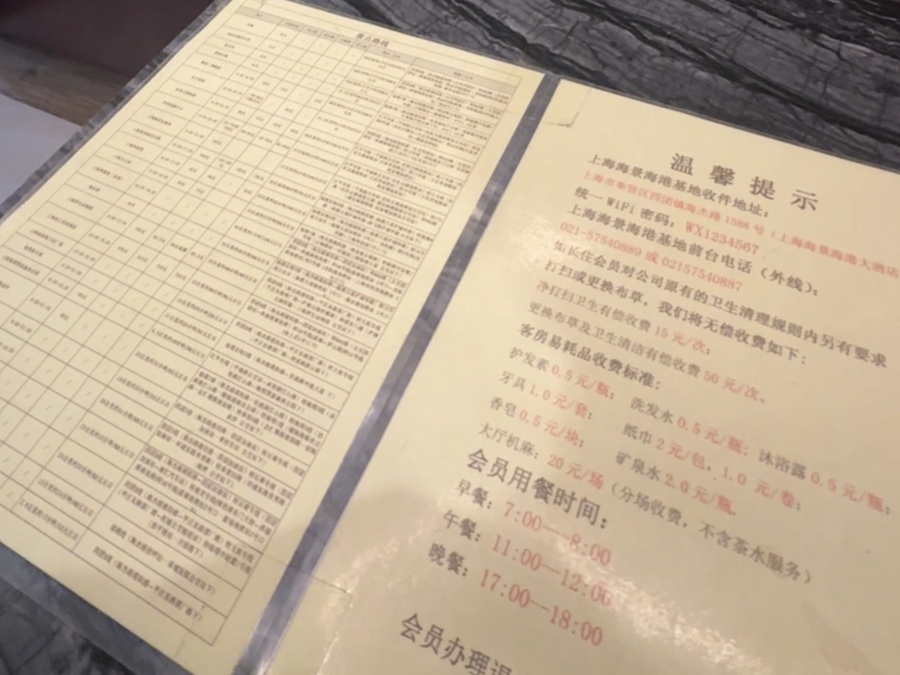 在酒店前台,记者看到营业执照显示的是上海海景海港大酒店有限公司。服务台上还放着一份全国基地的联系信息、一份三餐开餐时间的说明、一份收费明细。比如,更换布草及卫生清洁有偿收费50元/次,各类洗漱用品也都是有偿使用。记者以会员家属的身份咨询前台客服,对方表示,目前没有空余房间,可以先登记,有空房了会打电话通知。前面排队的还有250多人,预计要等到明年。付床位费的会员就是按天扣除,一天扣多少钱按合同来,具体可以问对接的销售。海南的君福苑、五指山基地还在运营,但也得报名登记。有入住的老人告诉记者,入住情况应该没有前台说的那么多。但想要进来住,需要和销售搞好关系。