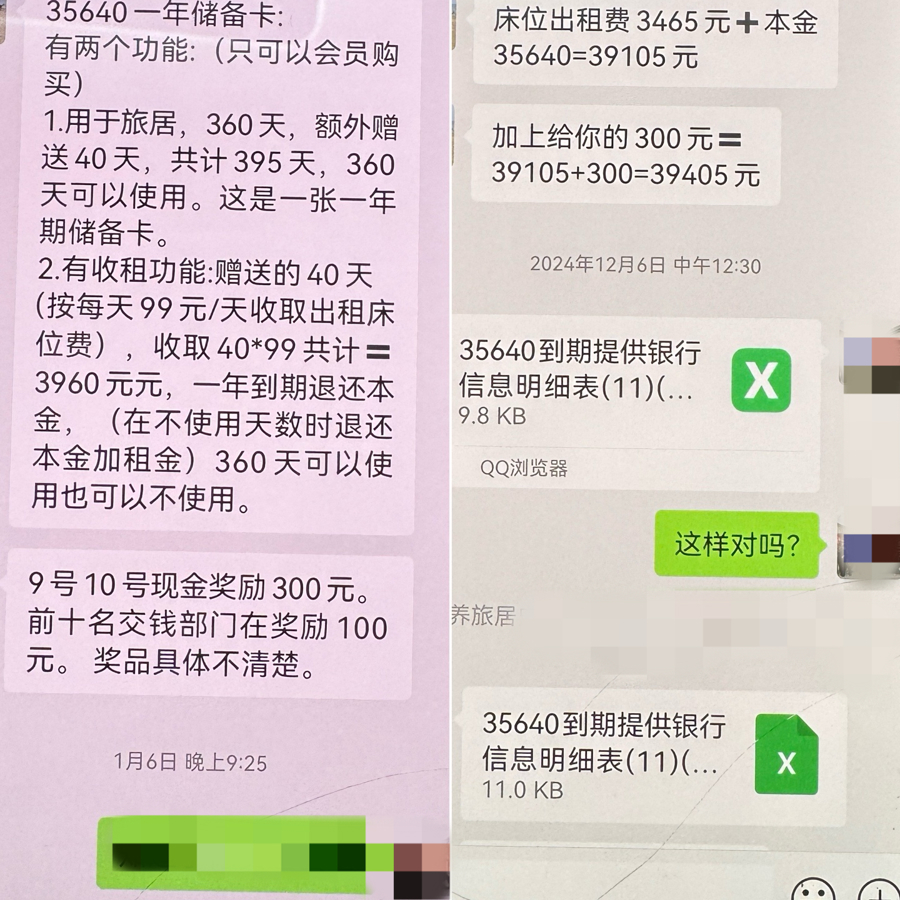 在业务员的介绍中,酒店已入住1000多位老人。在上海要开出第二家位于奉贤的基地,马上要落地第三个基地,比浦津酒店还要大一倍。现场火热的排队充值、签收“养老爱心卡租金”的场景令他好奇。“销售说,现在正在搞会员促销活动,床位卡若出租会有租金收益。比如35640元的‘床位卡’,如果不自住的话可以由公司回购代销返还租金。由于有40天的赠送,以99元一天租金计算,存一年可以拿到3960元,约等于11%的收益,相当于投资。我觉得不错,还做了最坏的打算,就算没有收益,我至少还可以到全国各地旅居自住。”销售还告诉他,如果购买96228元的三年床位卡,每个月直接就能拿1069元的返还。于是,他先后购买了一张价值96228元、有效期三年的会员卡,和一张35640元、一年有效期的会员卡,累计131868元。随行的同学也买了同样一组。