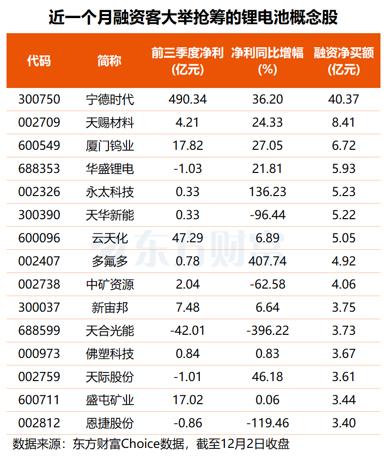 东方财富Choice数据显示,近一个月,多只锂电池概念股获杠杆资金加仓。其中,宁德时代融资净买额高达40.37亿元,天赐材料获抢筹8.41亿元,厦门钨业融资净买额约6.72亿元,华盛锂电、永太科技、天华新能、云天化等4股均获融资客超5亿元加仓。