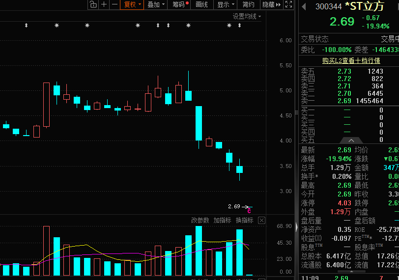 12月2日,*ST立方(300344)复牌一字跌停,盘中跌停板封单超过145万手。目前公司股价为2.69元/股,逼近历史低点。