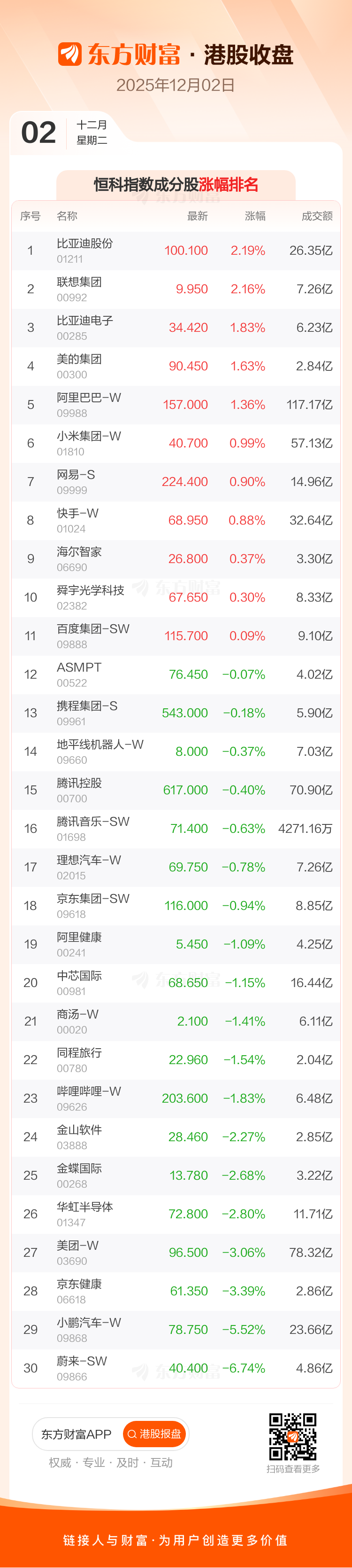 12月2日,恒生指数收报26095.05点,涨61.79点,涨幅0.24%;恒生科技指数收报5624.04点,跌20.72点,跌幅0.37%。恒生指数成分股中银河娱乐、恒安国际、百威亚太涨幅居前,超细玻璃棉板京东健康、药明康德、美团-W跌幅靠前。恒生科技指数成分股中比亚迪股份、联想集团、比亚迪电子涨幅居前,蔚来-SW、小鹏汽车-W、京东健康跌幅靠前。