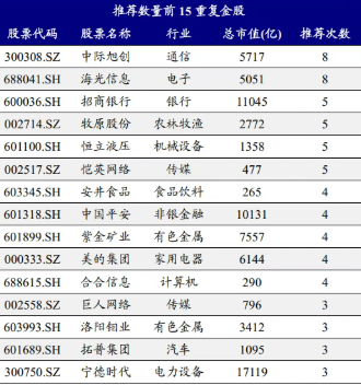 落实到各个热门行业方面,电子板块的最热金股为海光信息,合计被推荐了8次。电力设备板块为宁德时代、大金重工,合计均被推荐了3次。有色金属板块最热的是紫金矿业,合计被推荐了4次。