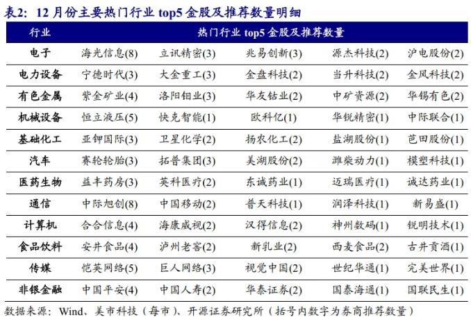 开源证券研报统计结果也显示,12月券商金股权重最靠前的行业为电子,且占比高达15.5%;电力设备紧随其后,占比为8.2%;有色金属、机械设备位居其次,占比分别为7.3%、6.7%。