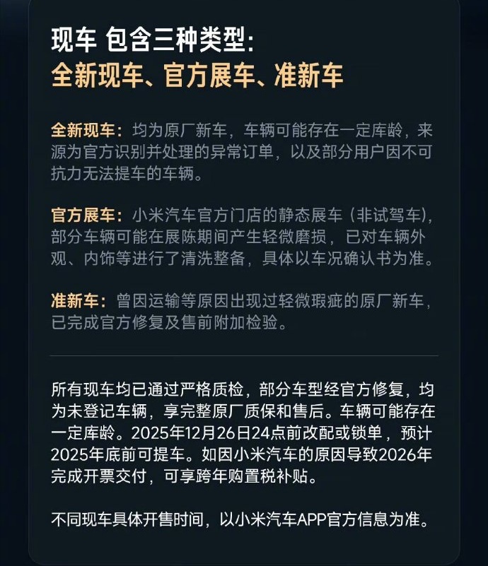 小米汽车方面强调,玻璃丝棉所有现车均已通过严格质检,部分车型经官方修复,均为未登记车辆,享完整原厂质保和售后。2025年12月26日24点前改配或锁单,预计2025年底前可提车。如因小米汽车的原因导致2026年完成开票交付,可享跨年购置税补贴。