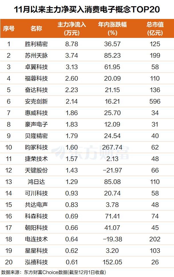 东方财富Choice数据显示,自11月以来,主力资金抢筹多只消费电子概念股,胜利精密排名第一,主力净买入近9亿元;苏州天脉排名第二,主力净买入近4亿元。