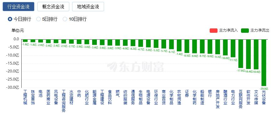 净流出方面,光伏设备、文化传媒、软件开发等净流出排名靠前,其中光伏设备净流出28.96亿元。