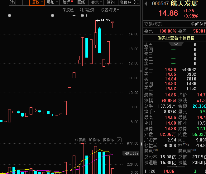 商业航天概念延续强势,航天发展(000547)一字板,斩获12天8板琼中离心玻璃棉,星图测控、航天环宇等涨超10%,雷科防务、光启技术、利君股份等涨停,通宇通讯斩获3连板。