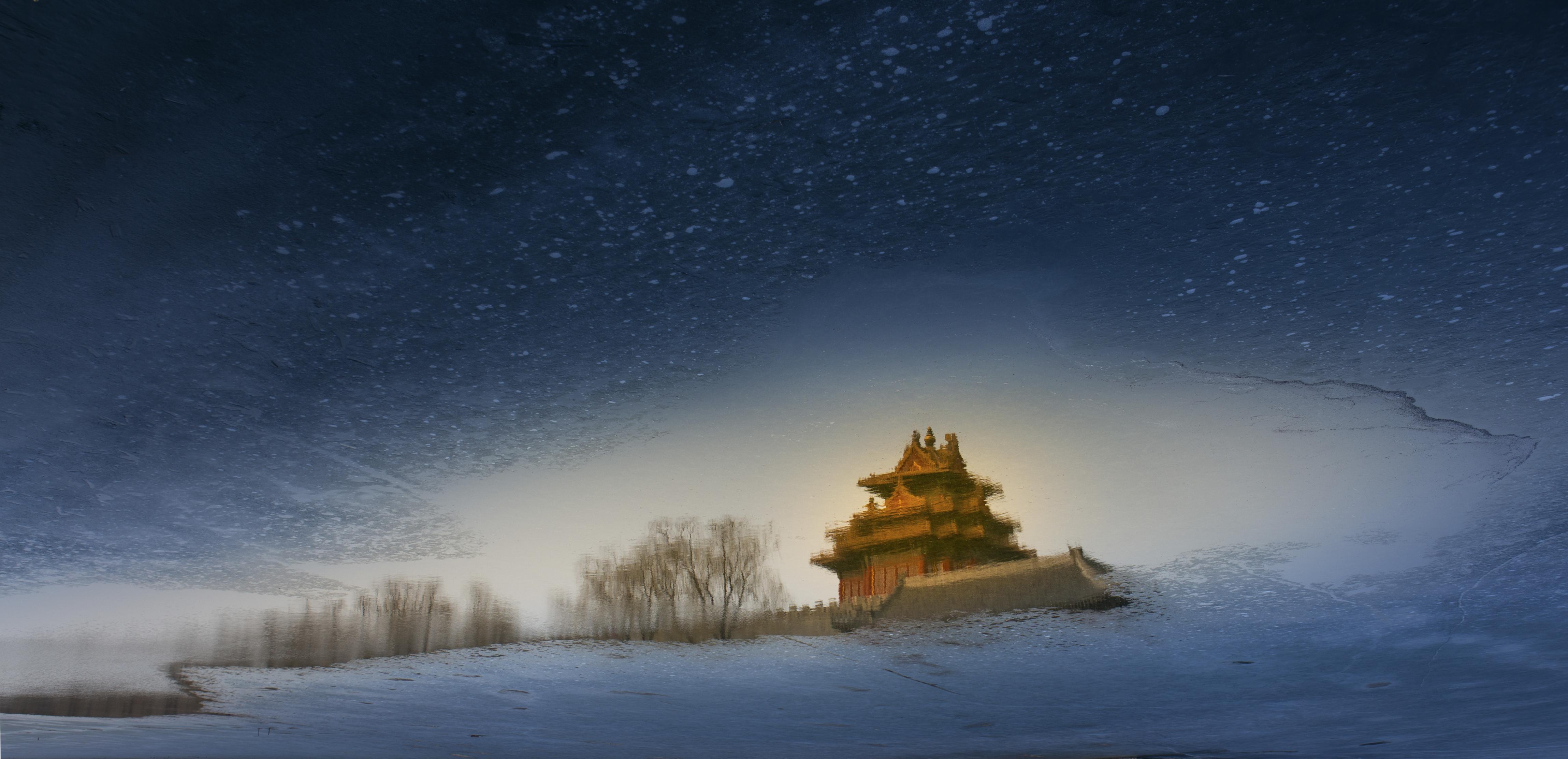 侯宪权记得,有一年初春,气温还在冰点以下,为了拍出冰水共融之际、故宫角楼在金水河中的倒影,他跑了三趟。“把角楼刚好‘装’进化开的冰面并不容易。第一次去的时候,玻璃棉冰面融化得不够,第二次赶上降温,水面的部分又结了一层薄薄的冰,第三次去才拍到我想要的画面。”他说,每次在金水河边,他一待就是一下午,拍完后想回看照片,他才意识到手指已经冻僵,“要等午后太阳渐渐落下的时候,而且天要足够蓝,拍出来的冰面才是透亮的蓝色。”他将这张照片取名为《疑是琼楼银汉来》,画面里,故宫角楼的倒影仿佛浮现在银河之中。