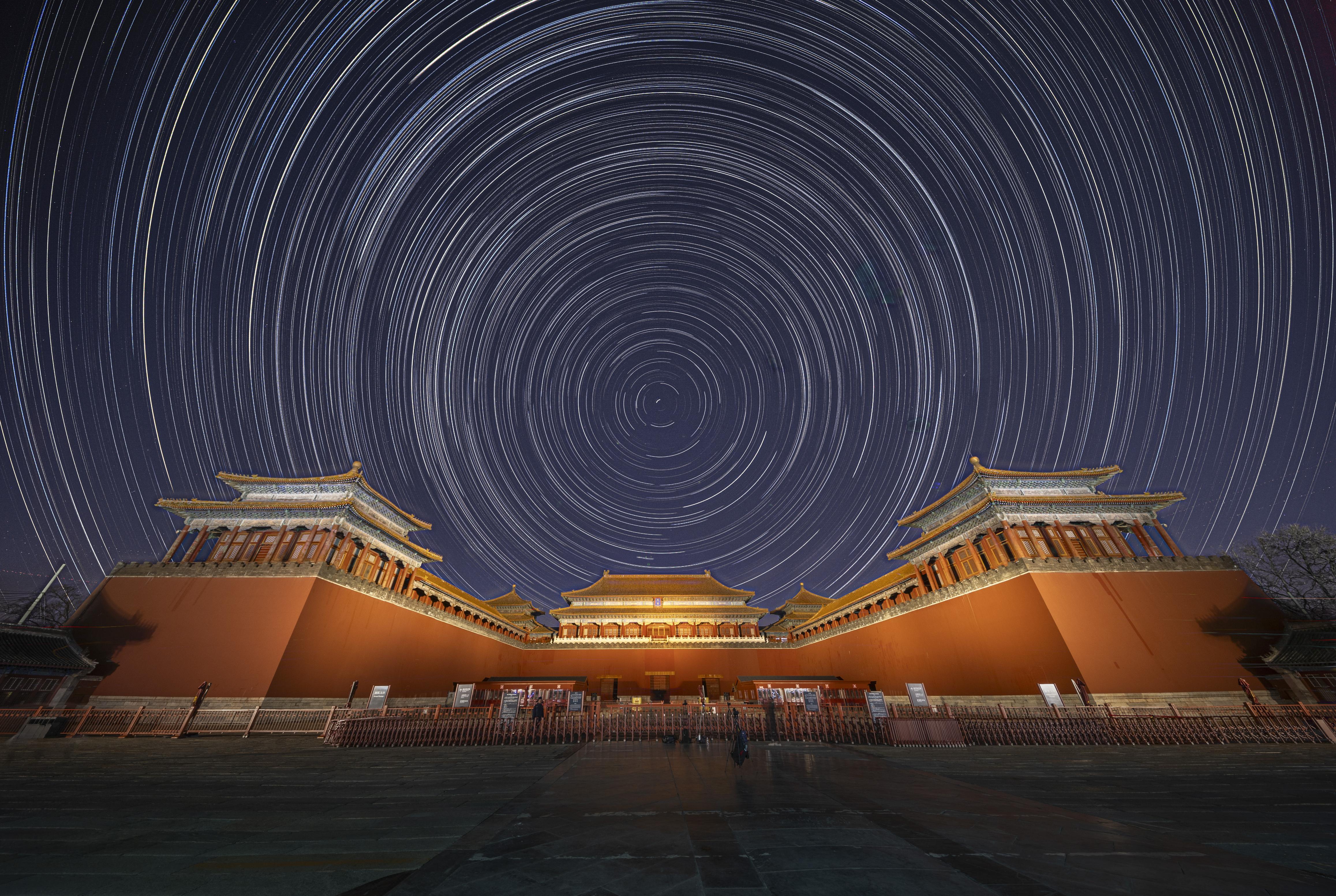 21时,夜幕渐浓,摄影师侯宪权来到故宫午门前,选好居中位置,稳稳架好相机,将镜头对准星空,设置连拍张数无限……大约3个小时,一张故宫午门的星轨照片诞生:雄伟的建筑,与星空完美融合,呈现出斗转星移的震撼画面。