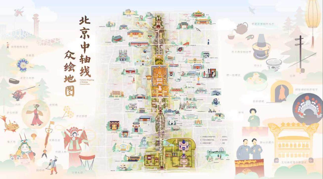 “我们的中轴线”成果展中,最大的展品是一幅10米长的北京中轴线众绘地图,共收录了88个图标,涵盖文物建筑、开放空间、文化设施、非遗民俗等元素。这是70人历时3个多月设计的。他们用脚步丈量中轴线,走访调研中轴线缓冲区内的文化资源,利用调研成果创作绘制中轴线文化地图。