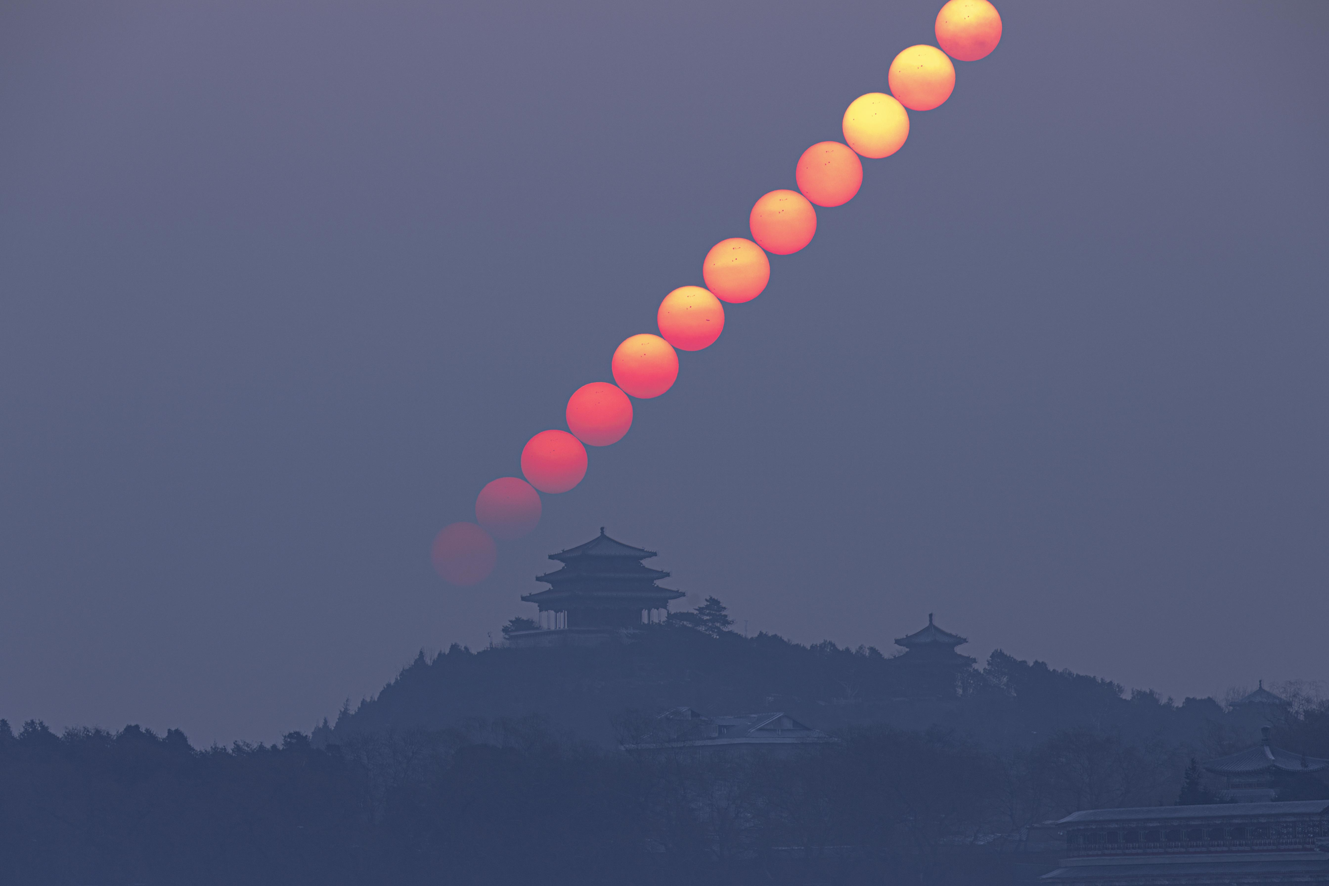 功夫不负有心人。他终于赶上一个雾蒙蒙的黎明,一轮旭日从景山公园的万春亭升起,他用延时拍摄的方法记录了旭日初升的过程。“我选择了12张照片,用堆栈的手法制作了一幅黎明时分景山升起一串红日的摄影作品。雾压暗了太阳的亮度,太阳呈现出变幻的橙红色调,将照片放大来看,太阳黑子清晰可见。”侯宪权说。