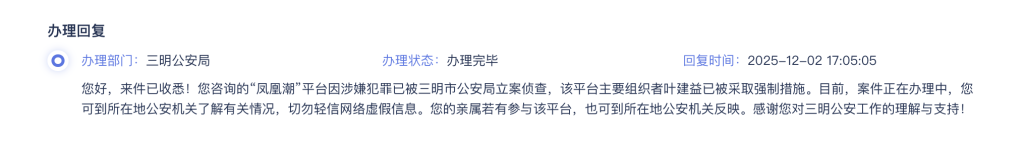 11月20日,澎湃新闻发布《凤凰潮APP实控人叶建益因涉嫌传销被刑拘,此前多地政府发出风险提示》指出,凤凰潮的实控人叶建益因涉嫌传销犯罪已被福建三明警方刑拘。