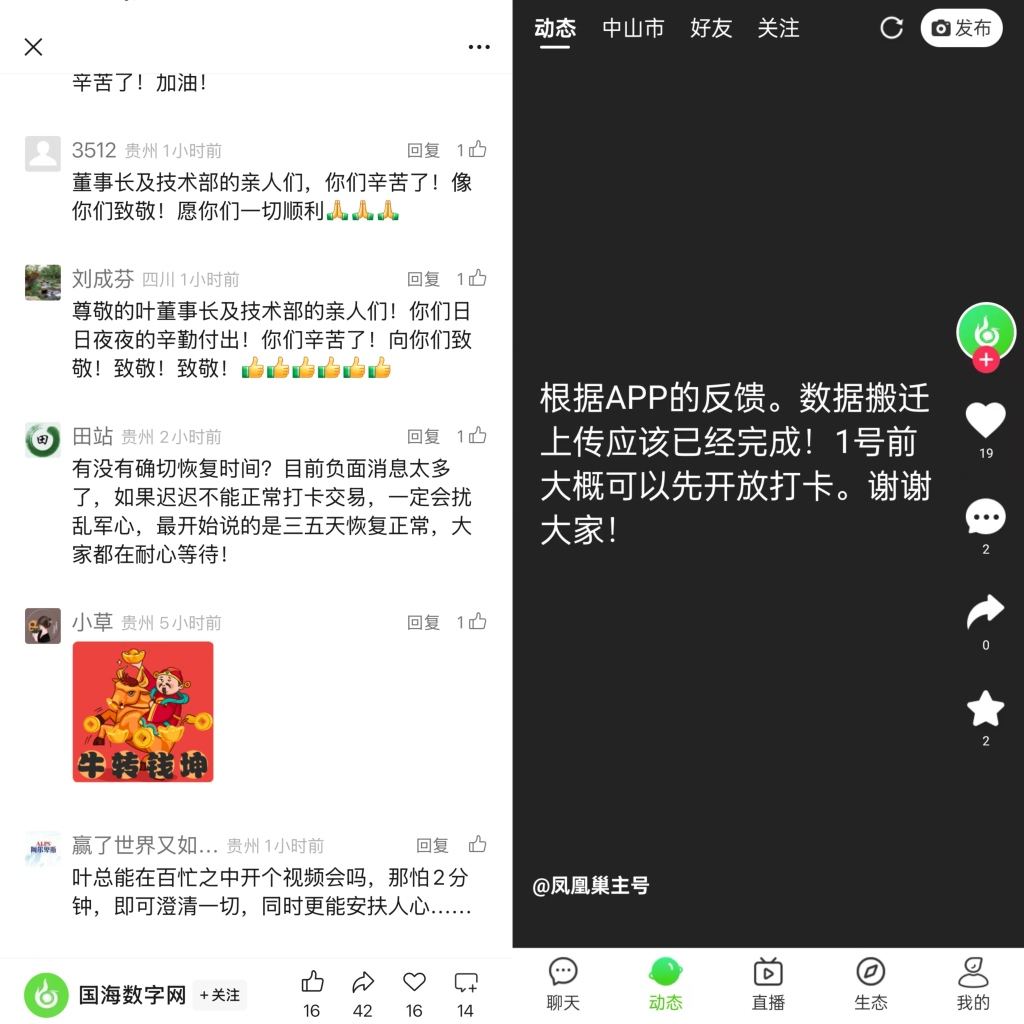 起初,一个名为“国海数商创业”的公众号曾于11月19日发布《凤凰潮(国海)暂停打卡:为什么有人说“要出事”?真相恰好相反》的文章,将平台暂停打卡等功能解释为“防火墙强化、功能调整及舆情隔离系统升级”,称升级为期3-5天,目的是扩容平台承载量。