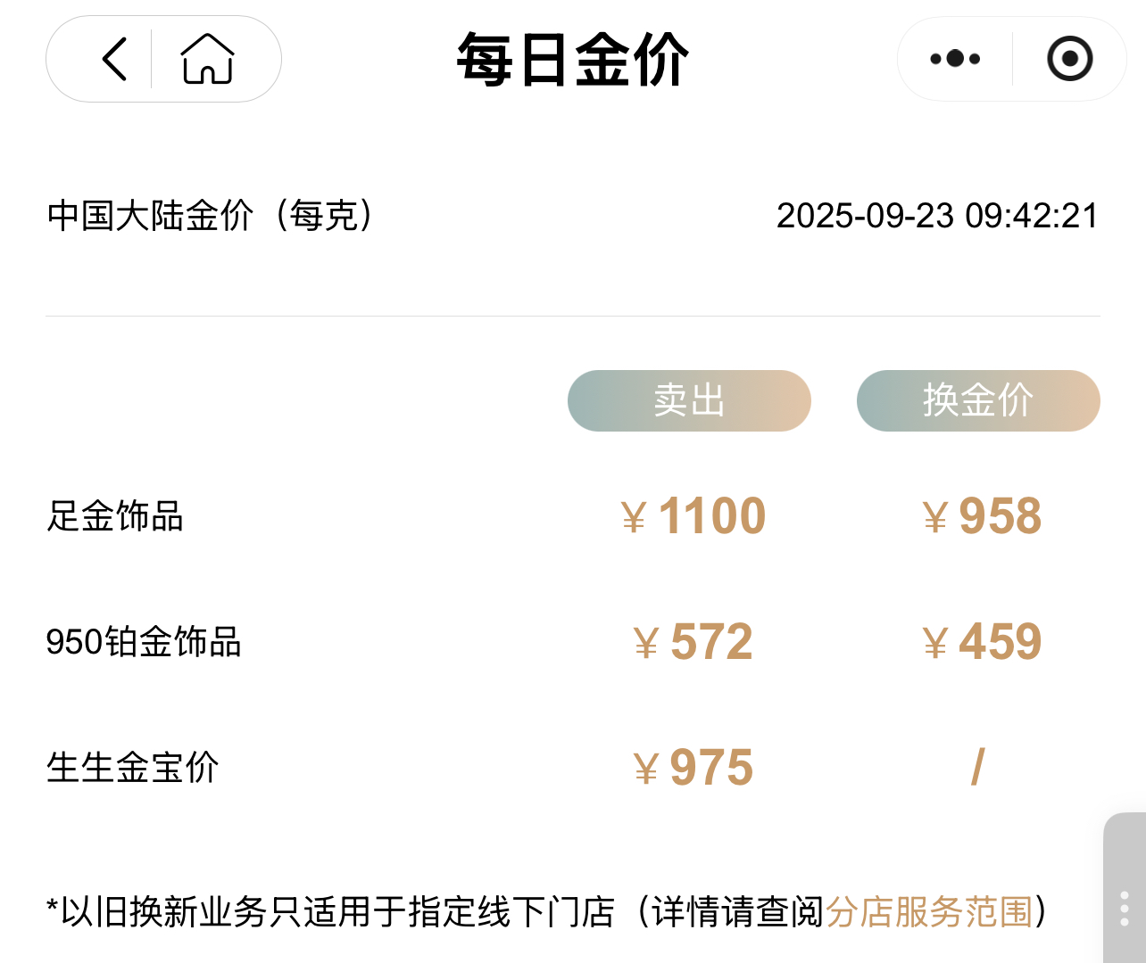 国内黄金饰品方面,数据显示,9月23日,老庙黄金为1097元/克,较前一日的1084元/克大幅上涨;周生生金饰价格为1100元/克,周大福足金首饰报1098元/克,六福珠宝、金至尊为1098元/克,均较前一日有所上涨。