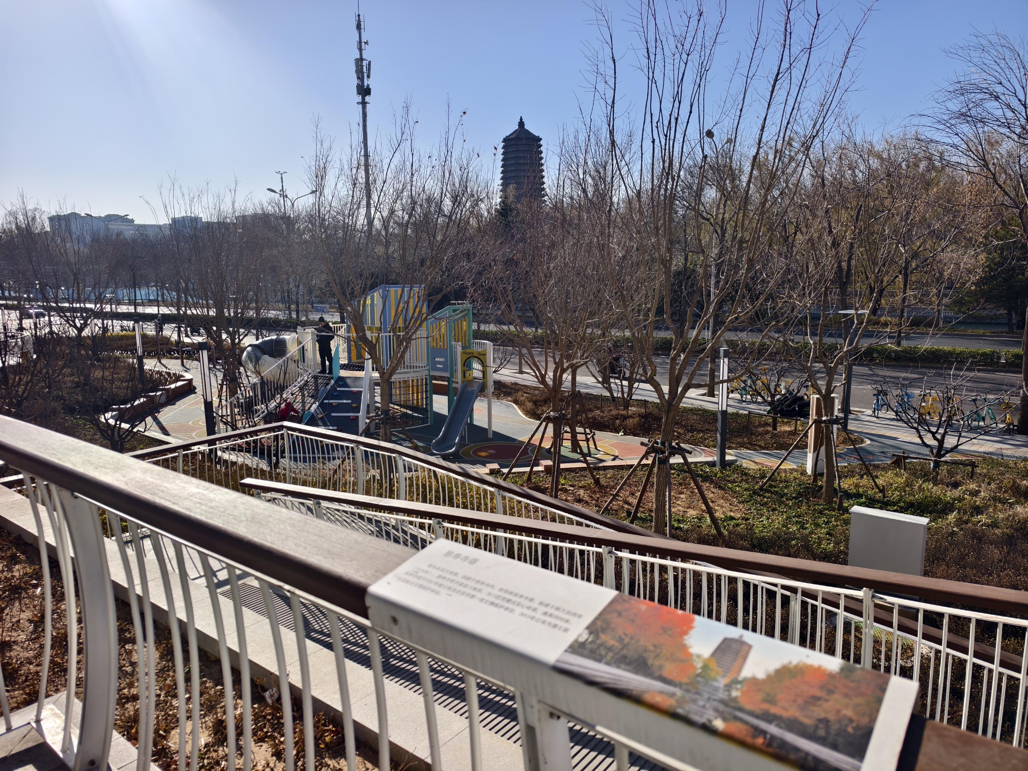 在悬空的“塔影台”,远眺,始建于明万历年间的慈寿寺塔在望,昆玉河横亘,近处,无动力儿童游乐设施上,孩子在网绳区攀爬,老人在健身器材处锻炼。“塔影台”下的空间还被打造成风雨廊,围着柱子特意设计了桌椅,方便游人休憩。