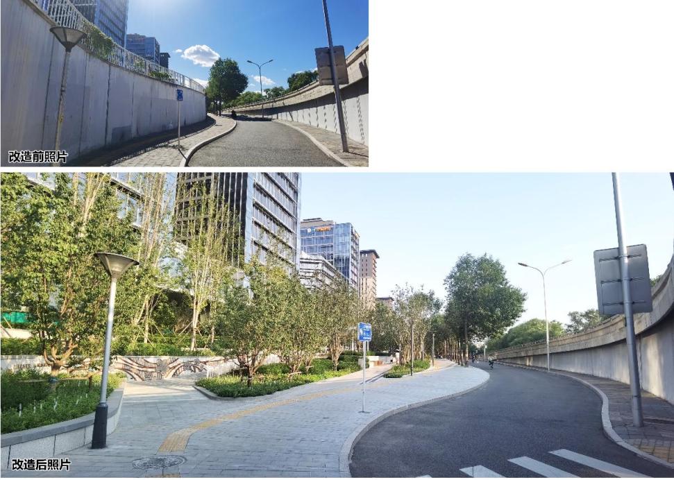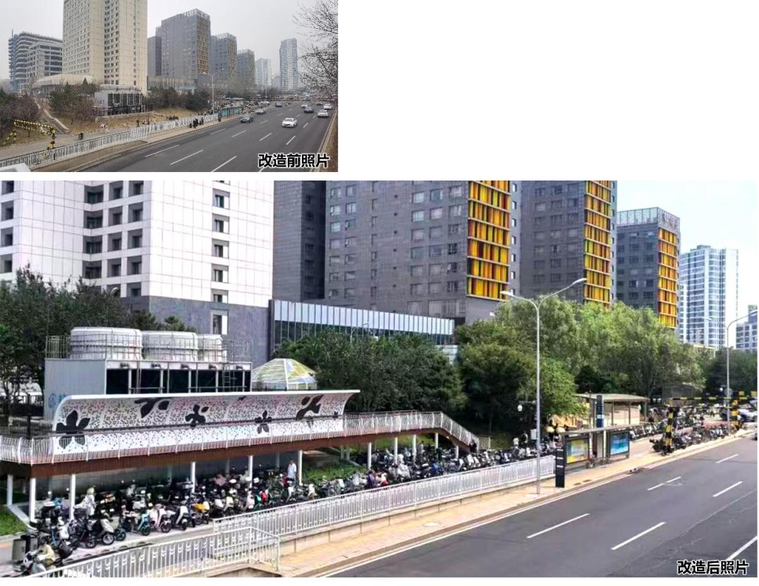 此外,通过此次改造,位于八里庄桥南侧桥区绿地内的西钓鱼台地铁站,也通过增加架空栈道,实现有限空间的复合利用,上层走人,下层停放非机动车,有效缓解了站点区域通行不顺畅的问题。