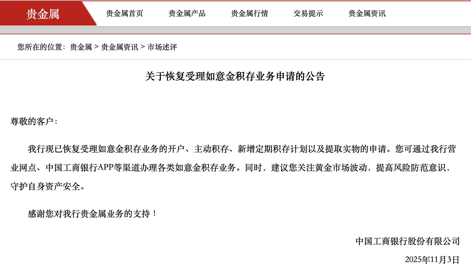 11月3日晚,工商银行公告,现已恢复受理如意金积存业务的开户、主动积存、新增定期积存计划以及提取实物的申请。同时,工商银行建议关注黄金市场波动,提高风险防范意识,守护自身资产安全。