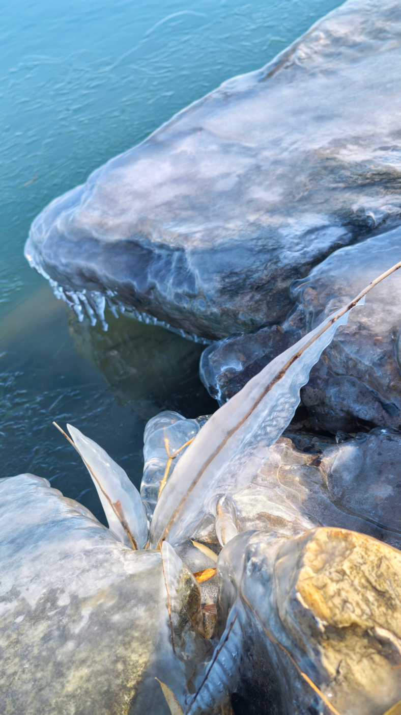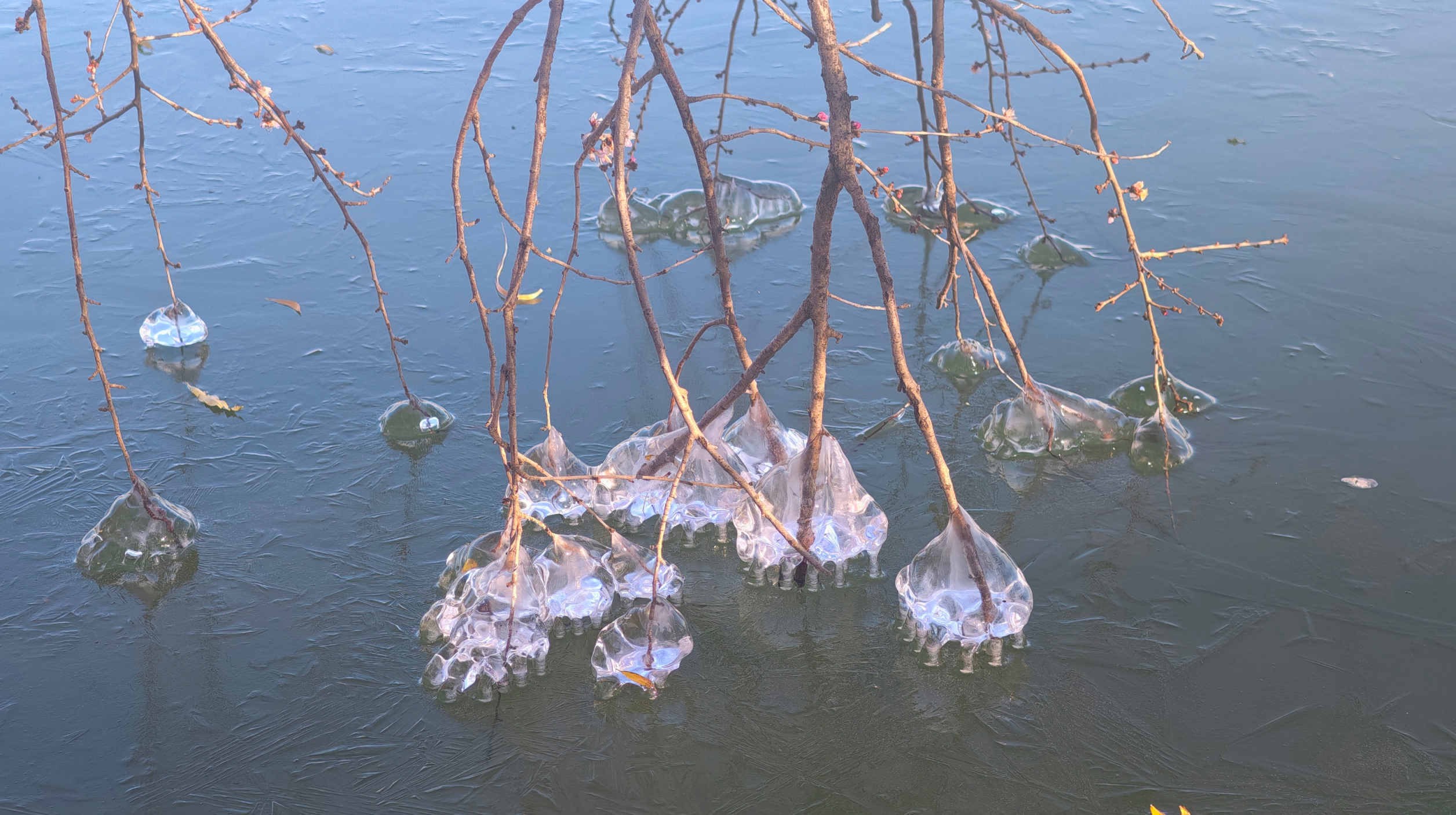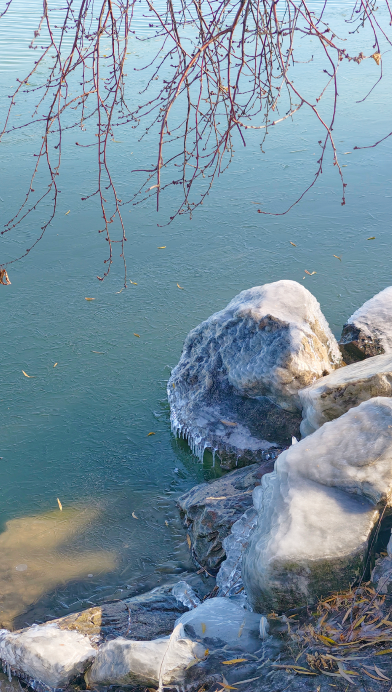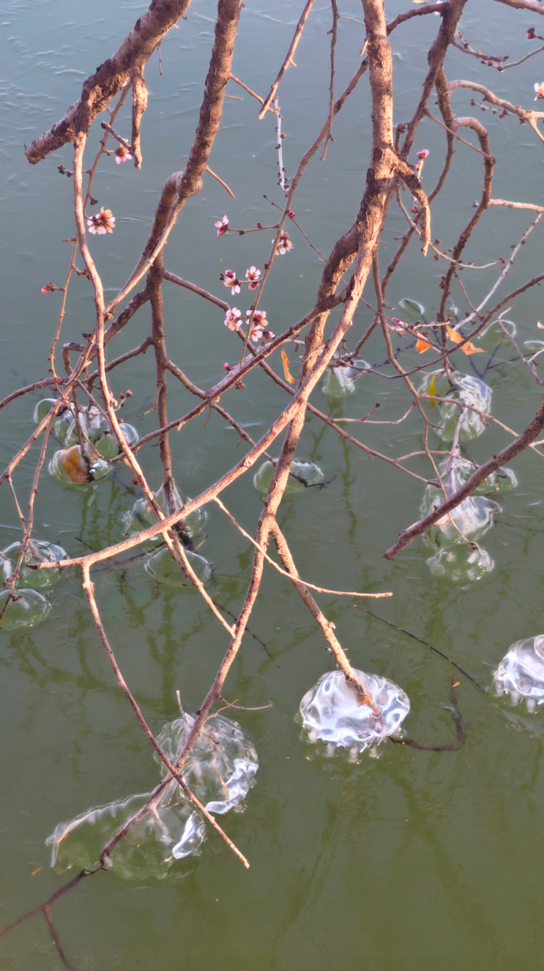 岸边的树枝探向冰面,玻璃棉被透明的冰紧紧裹住,像是大自然亲手打造的水晶雕塑。偶尔路过的鸭子、零星绽放的桃花,则为这独特的景致增添了几分活力。