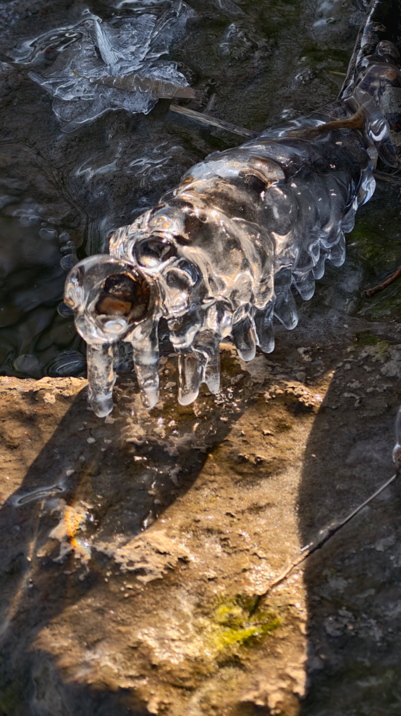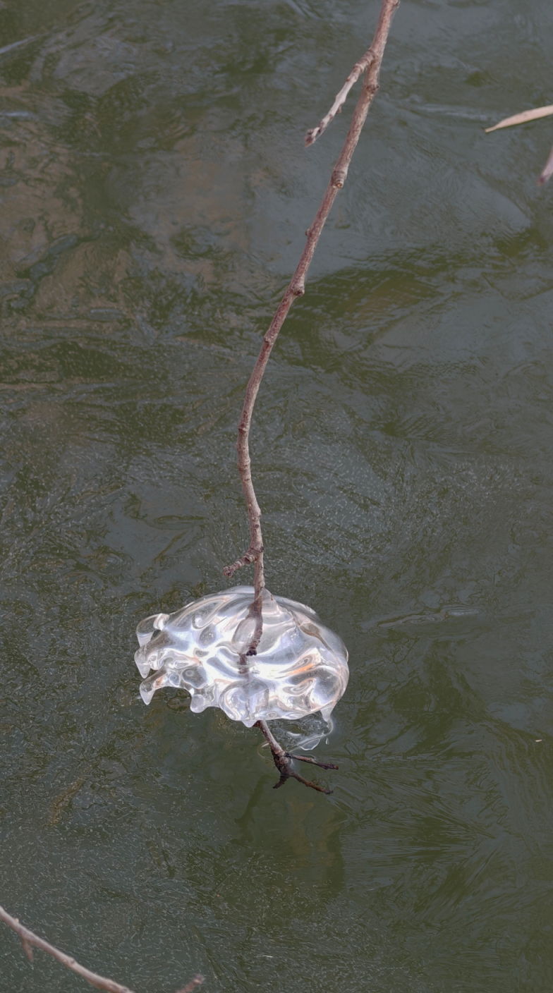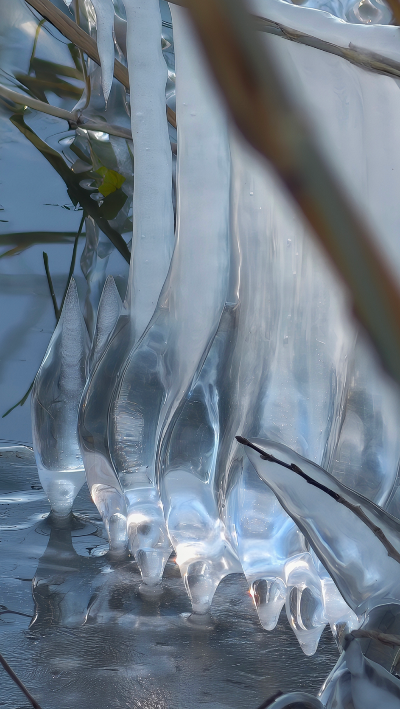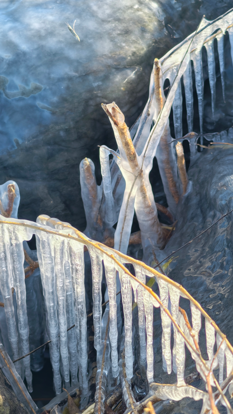 岸边的树枝探向冰面,玻璃棉被透明的冰紧紧裹住,像是大自然亲手打造的水晶雕塑。偶尔路过的鸭子、零星绽放的桃花,则为这独特的景致增添了几分活力。