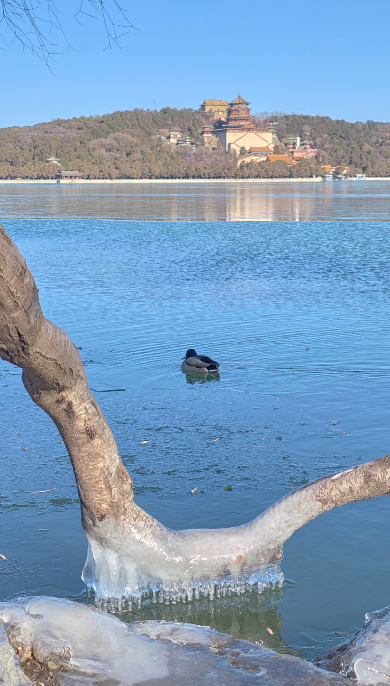 今日北京最高气温只有3℃,风寒效应明显,颐和园昆明湖表面结了薄薄一层冰,在阳光的照射下仿佛裹了一层水晶纱。