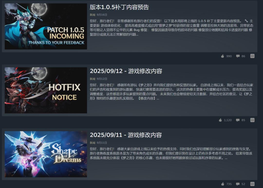 不过,制作组仍然保持着一贯的高频更新风格,在接连不断的补丁和新内容补充后,如今《梦之形》的近期好评率已经恢复到了“特别好评”。