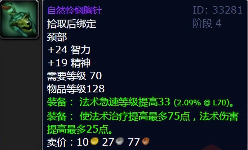 祖阿曼这个提升小团本,不仅有狂暴者召唤和妖术之颅这样的常规炸裂极品装备,更有像自然怜悯胸针这般的超模项链,玻璃丝棉埃基尔松掉落的他名副其实的BUG级装备,暂且不谈万年TBC畸形天赋下,术士等职业拿了极其恐怖如斯,就单纯奶德和牧师而言,你说版本毕业水准也是不遑多让的。33点的急速等级之下,还有高额的精神、智力以及法术治疗提高,真真是高端治疗必争之品!