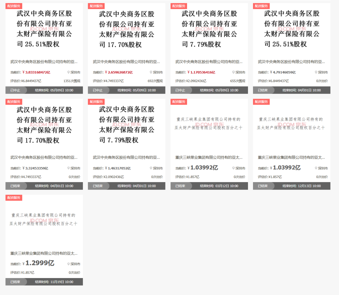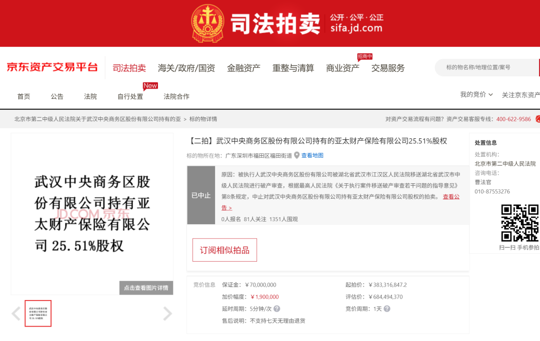 4月28日晚间,已退市的泛海控股发布公告称,今年2月,公司收到北京二中院《拍卖通知书》,将通过京东网络司法拍卖平台对控股子公司武汉中央商务区持有的亚太财险51%股权分三笔(股权比例分别为17.70%、7.79%、25.51%)进行公开司法拍卖。