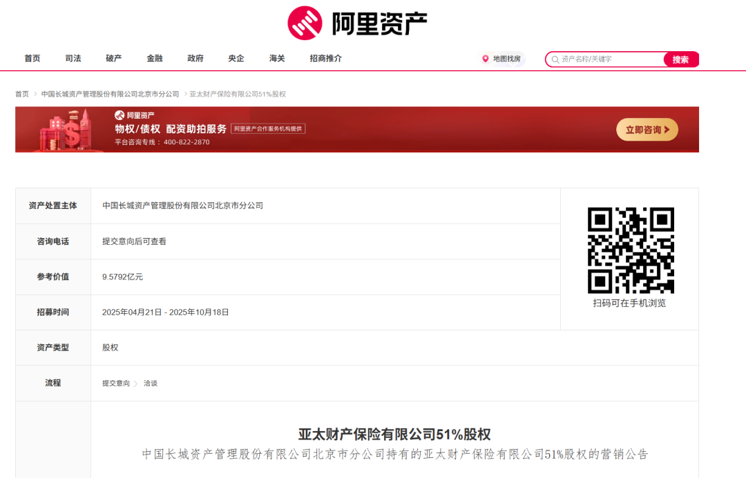 记者在阿里资产拍卖平台查询发现,玻璃棉毡长城资产北京分公司曾对上述股权进行招商推介,招募时间为2025年4月21日至2025年10月18日。公告给出的股权参考价值为9.58亿元,并认为保险牌照具备较高的投资价值,质押比例为51%有利于受让方控股财险公司,获得公司控制权。