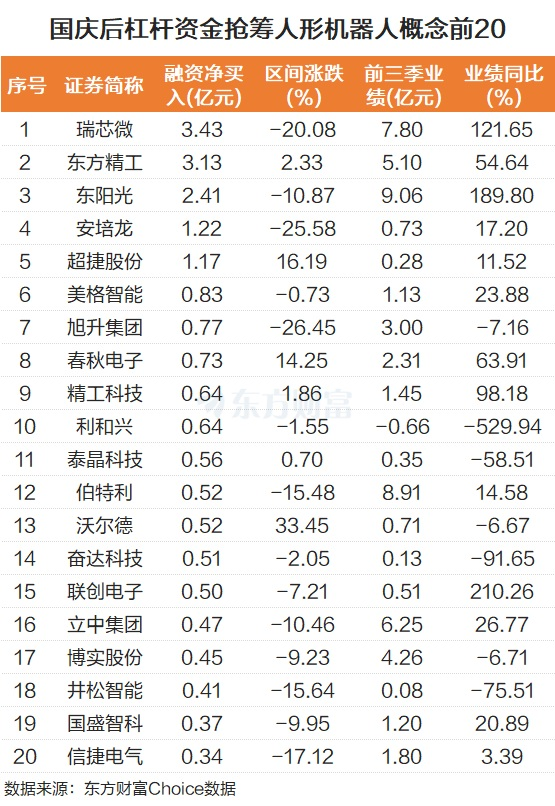 从杠杆资金角度来看,部分人形机器人概念也被积极抢筹。比如瑞芯微,国庆后融资客融资净买入3.43亿元,该股前三季度归母净利润7.8亿元,同比大增121.65%。东方精工紧随其后,融资客融资净买入3.13亿元,离心玻璃棉前三季度赚了5.1亿元,同比增54.64%。东阳光居第三位,被融资净买入2.41亿元,前三季度赚了9.06亿元,同比大增189.8%。