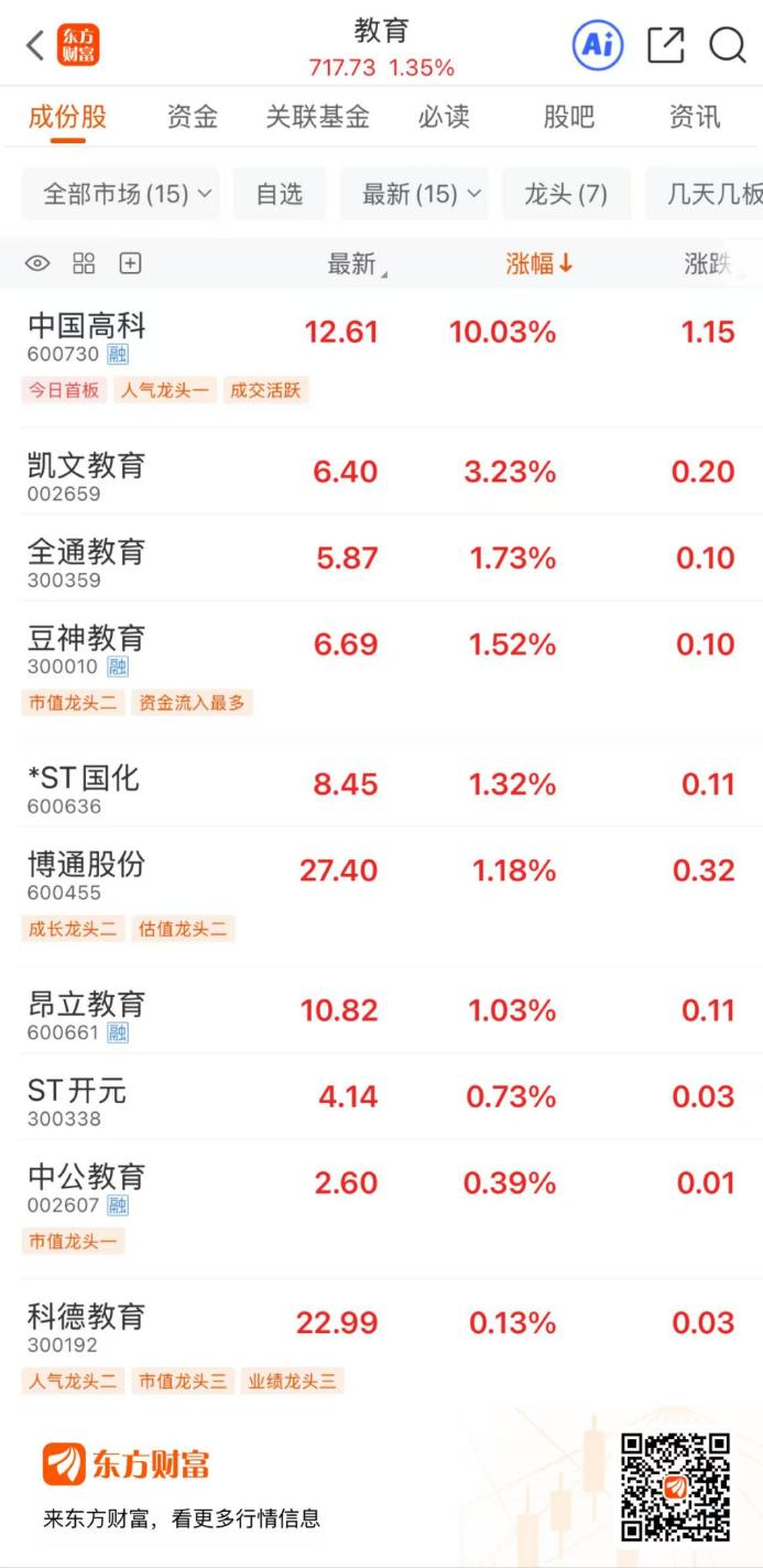 11月28日,A股“AI+”的风吹到了教育。截至早间收盘,教育板块上涨1.35%,涨幅在两市行业板块中位居前列。个股方面,中国高科涨停,凯文教育涨超3%阿勒泰防火材料,全通教育、豆神教育、*ST国化、博通股份、昂立教育等多股涨超1%。