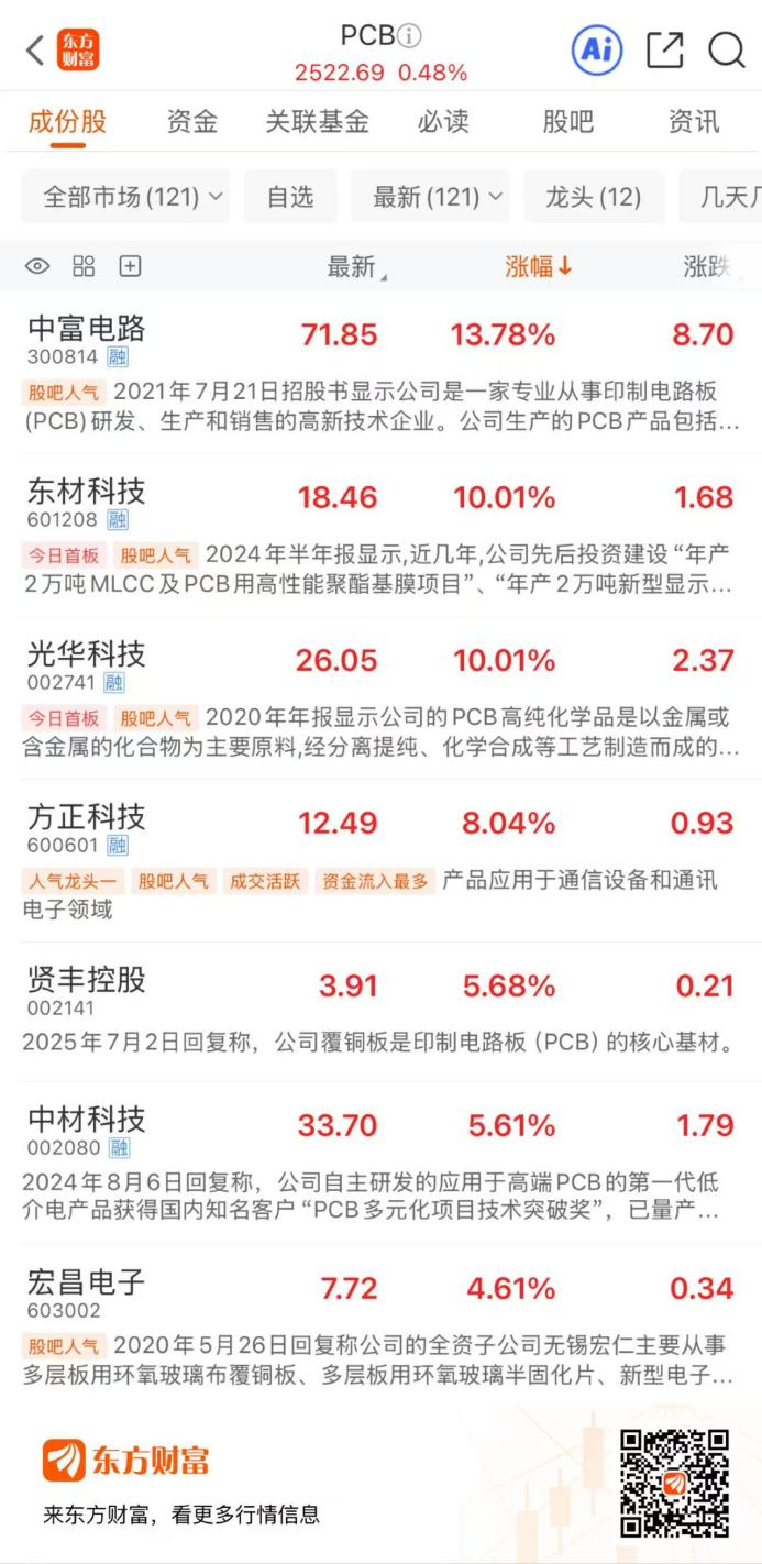 11月20日,A股PCB概念大幅高开,开盘后多股异动。截至早盘收盘,中富电路涨超13%酒泉玻璃纤维棉,东材科技、光华科技涨停,方正科技涨超8%,贤丰控股、中材科技涨超5%,宏昌电子、亨通股份等涨超4%。