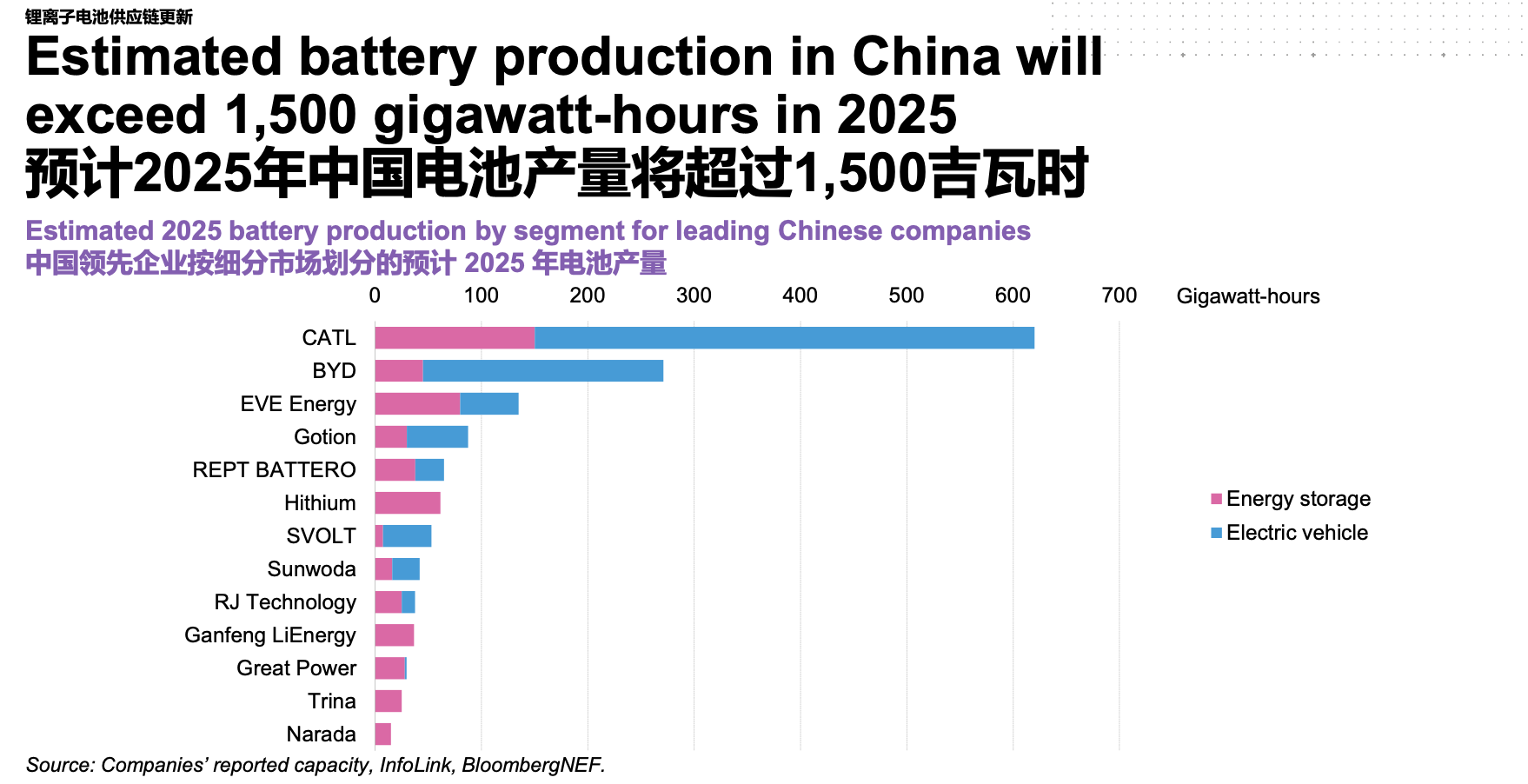 具体到企业,彭博新能源财经预计,今年宁德时代(300750.SZ)电池产量超过600 GWh,比亚迪(002594.SZ)近300 GWh,亿纬锂能(300014.SZ)超过100 GWh。
