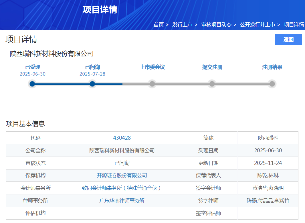 资料显示,陕西瑞科成立于2003年,主要从事贵金属催化剂的研发、生产、销售、加工及失活贵金属催化剂回收再加工等业务。2014年,公司股票在股转系统挂牌公开转让。按照市场层级调整程序,陕西瑞科自2022年6月15日起调入创新层。 此后公司便开启了上市辅导,先从深交所主板转向创业板双河玻璃棉,后主动撤回创业板申请材料并转道北交所。