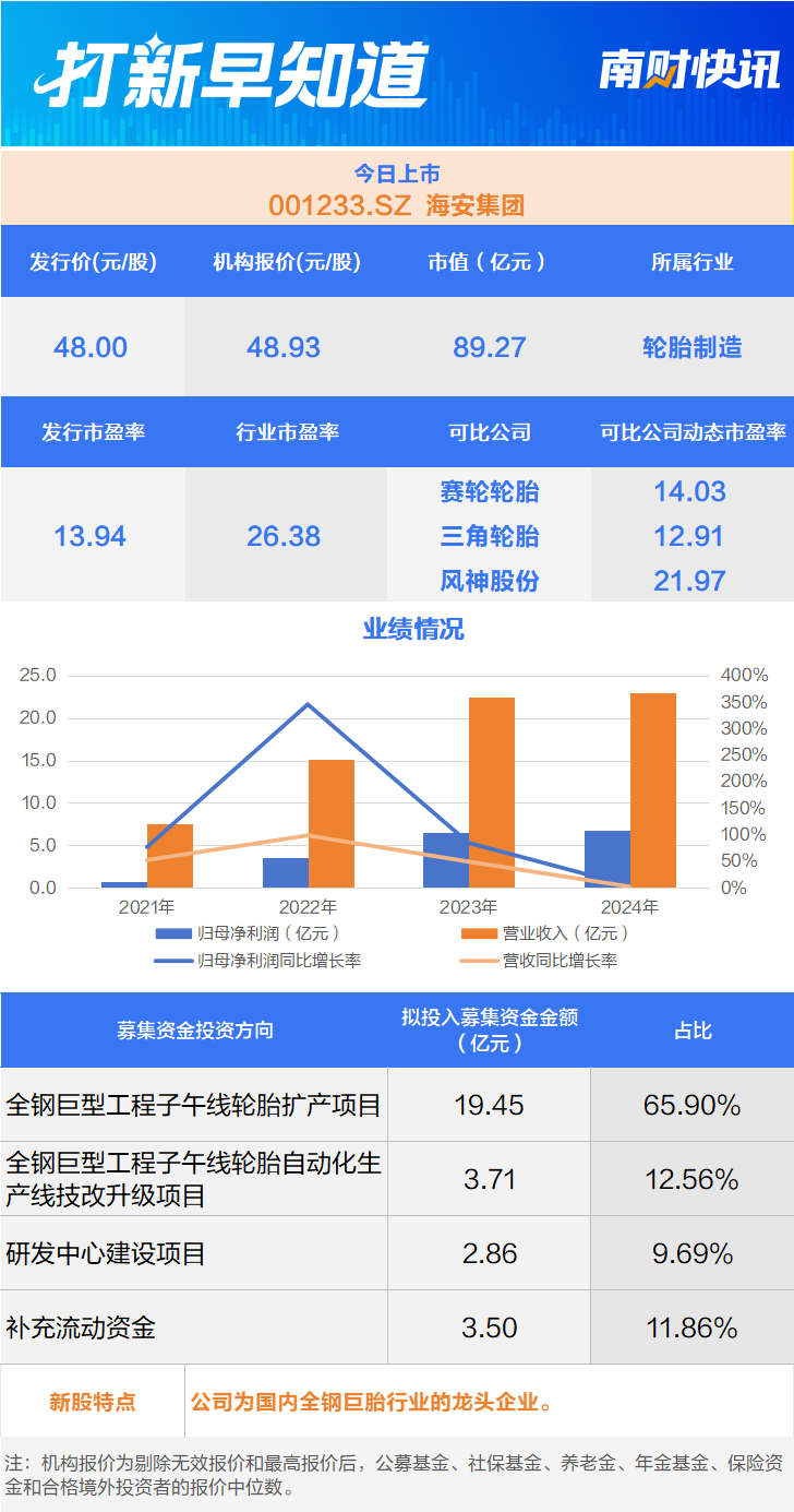 11月25日沧高温玻璃棉,有一只新股上市,为深证主板的海安集团(001233.SZ)。该公司主营业务包括巨型全钢工程机械子午线轮胎的研发、生产与销售,以及矿用轮胎运营管理业务。公司为国家高新技术企业,于2021年被工业和信息化部评为国家级专精特新“小巨人”企业,于2018年被工业和信息化部评为“服务型制造示范企业”。