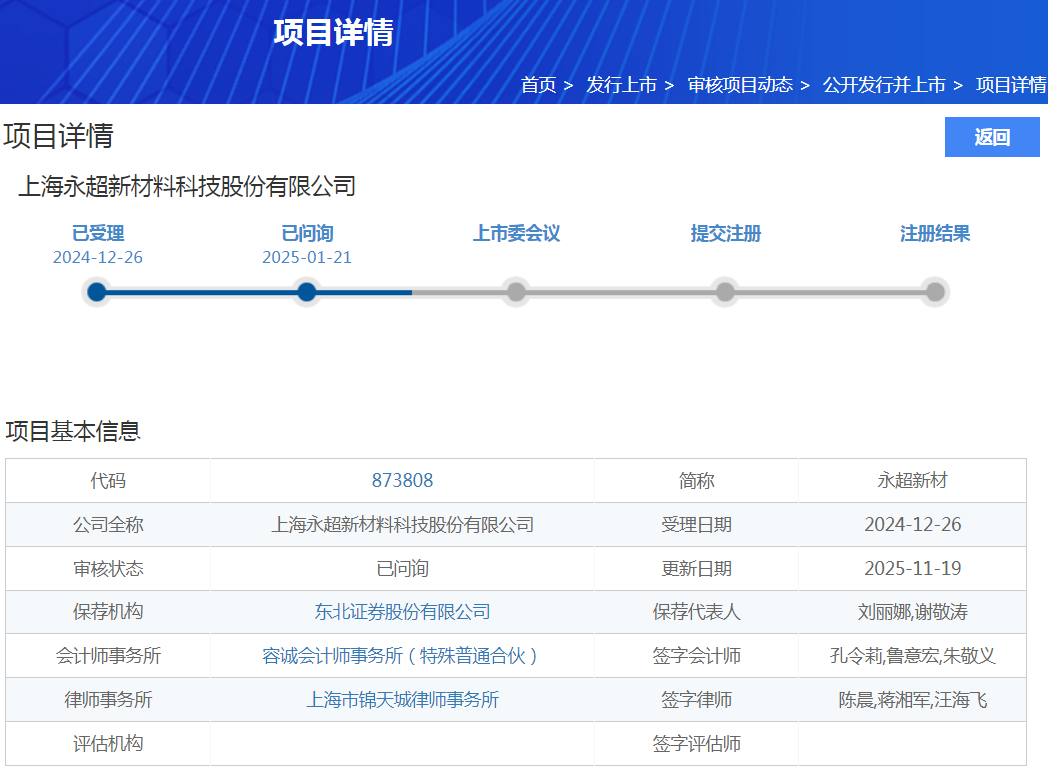11月19日,上海永超新材料科技股份有限公司(以下简称“永超新材”)在北交所更新上市申请审核动态,公司已收到第二轮审核问询函张家界无甲醛环保玻璃棉,控制权稳定性、毛利率异常、收入真实性、业绩持续性、募投项目必要性等问题引发监管关注。