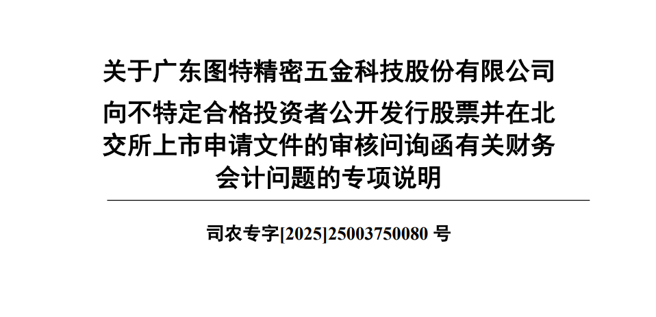 广东图特精密五金科技股份有限公司(下称“图特股份”)在终止主板IPO后转战北交所,2024年登陆新三板,今年7月获北交所受理,并于11月披露首轮问询回复,此时距离收到问询函已经过去三个多月。在7月25日的问询函中,监管一连提出了10大问题,关注点涉及股权结构、成本费用变化和研发投入,也要求公司解释与大客户合作的商业逻辑与独立性。