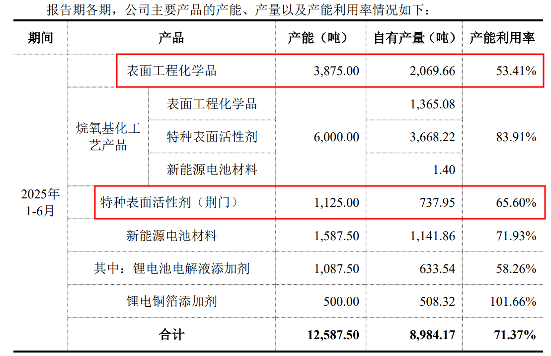 其中,2025年上半年,公司表面工程化学品产能利用率仅53.41%,特种表面活性剂(荆门)产能利用率65.60%,均低于70%。