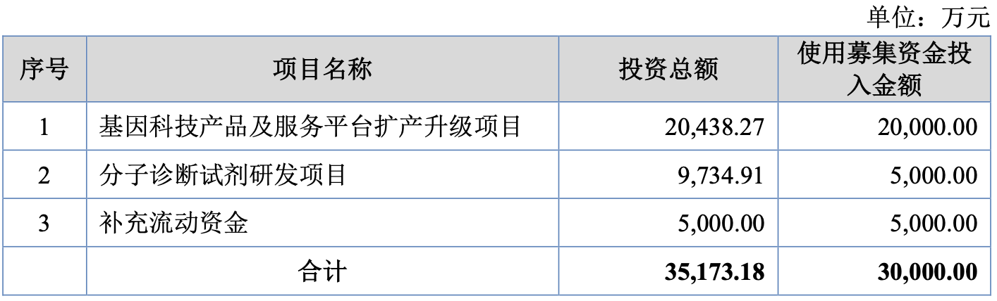 而此次申报北交所IPO,其募资规模下滑50.66%至3亿元,募资金额整体“腰斩”,其中20000万元用于基因科技产品及服务平台扩产升级项目,5000万元用于分子诊断试剂研发项目,5000万元用于补充流动资金。