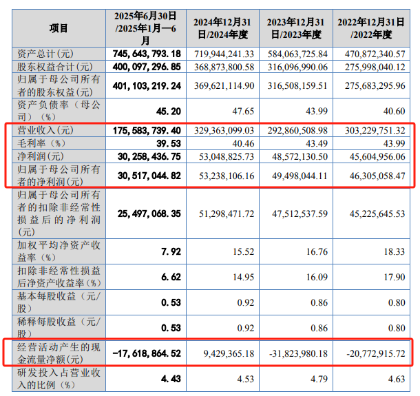 财务数据显示,巍特环境的营收存在波动,毛利率呈明显下滑趋势。2022年至2024年及2025年上半年(下称“报告期”),公司营业收入分别为3.03亿元、2.93亿元、3.29亿元、1.76亿元;净利润分别为4560.50万元、4857.21万元、5304.88万元、3025.84万元。