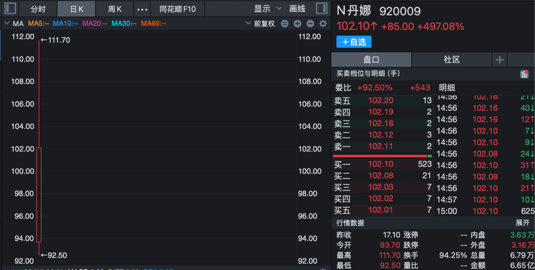 上市首日,丹娜生物表现强势,高开高走,每股股价一度攀升至111.70元,收盘暴涨497.08%至102.1元,为北交所再添一只百元股。