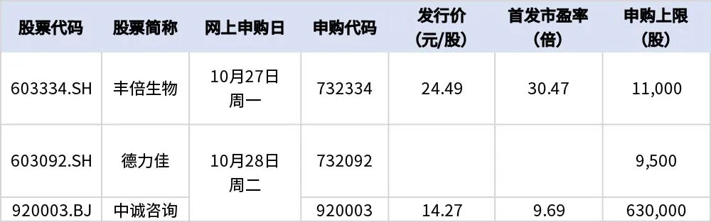 根据目前安排,本周将有3只新股可申购。拟于周一(10月27日)申购的丰倍生物是国内第一梯队的废弃油脂资源综合利用企业,且是废弃油脂资源综合利用发展的重要创新者、推动者。在生物燃料方面,公司客户覆盖托克、嘉能可等全球知名大宗商品交易商,以及嘉吉、壳牌、英国石油公司等全球知名终端。在农化细分应用领域,公司目前已与丰乐种业、久易股份、泸天化、四川美丰、芭田股份等农化龙头企业达成长期合作。