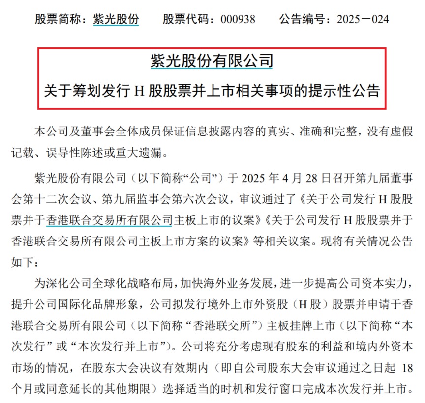 紫光股份4月28日晚发布公告称,为深化公司全球化战略布局,加快海外业务发展,进一步提高公司资本实力,提升公司国际化品牌形象,公司拟发行境外上市外资股(H股)股票,并申请于香港联合交易所有限公司(以下简称香港联交所)主板挂牌上市。