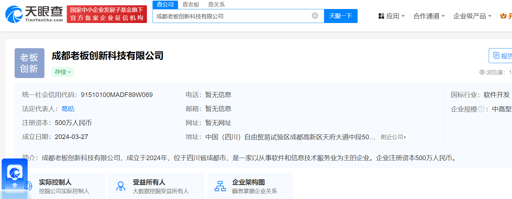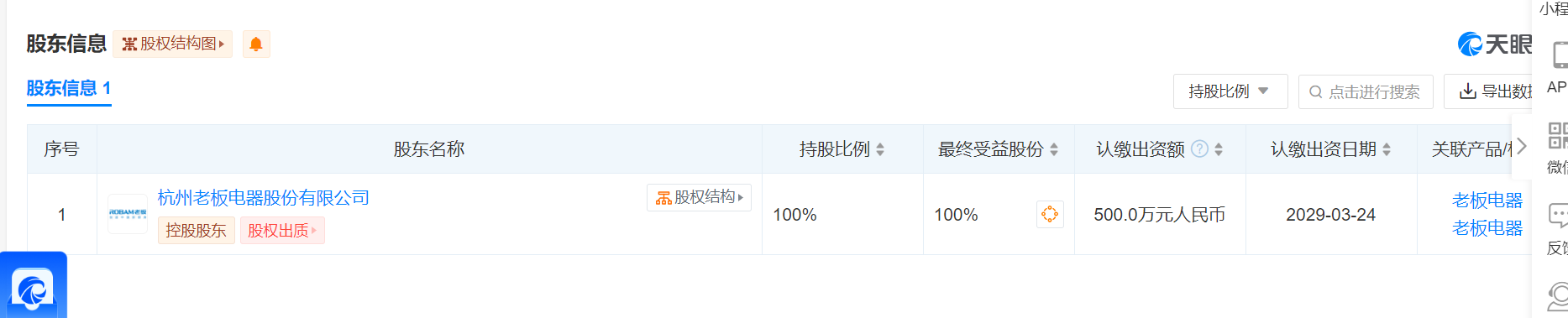 天眼查App显示,近日,成都老板创新科技有限公司成立,法定代表人为葛皓,注册资本500万人民币,经营范围含工业设计服务、人工智能应用软件开发、人工智能理论与算法软件开发、人工智能通用应用系统、互联网数据服务、家用电器研发、可穿戴智能设备销售等。股东信息显示,该公司由老板电器(002508)全资持股。