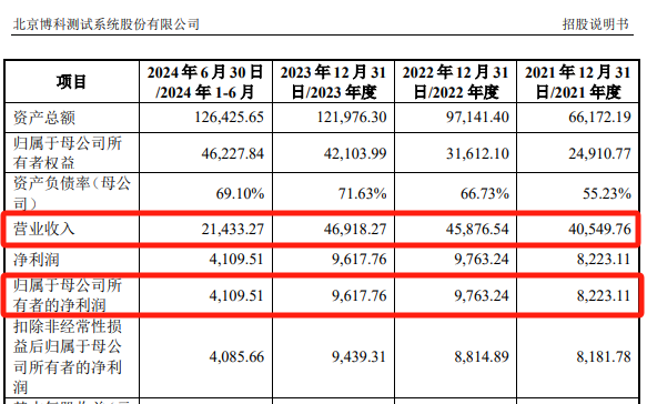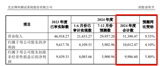 博科测试预计,公司2024年的营业收入为5.14亿元,同比增长9.53%;归母净利润为1亿元,同比增长4.10%。