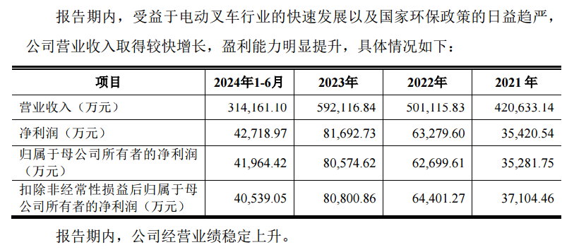 2021年至2023年,中力股份分别实现营业收入42.06亿元、50.11亿元、59.21亿元;归母净利润为3.53亿元、6.27亿元、8.06亿元。