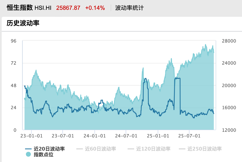 从整体市场角度看,第一财经注意到,今年以来,恒生指数与沪深300的相关性进一步增强。Wind数据显示,两者的日涨跌幅1年滚动相关系数从2024年至今一直处于波动上升状态。与之对应,港股的波动率也有所上升。恒生指数的近20日波动率,在2024年9月前基本在20%上下浮动,但去年10月、今年4月一度突破50%。