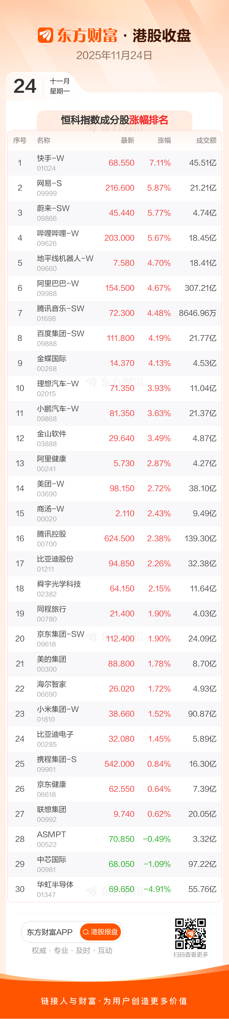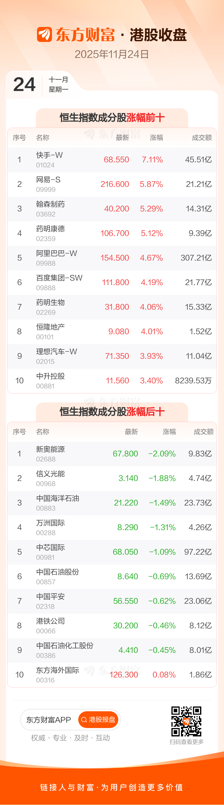 港股11月24日收盘走高,恒生指数收报25716.5点,涨496.48点,涨幅1.97%;恒生科技指数收报5545.56点,涨150.07点,涨幅2.78%。恒生指数成分股中快手-W、网易-S、翰森制药涨幅居前,新奥能源、信义光能、中国海洋石油跌幅靠前。恒生科技指数成分股中快手-W、网易-S、蔚来-SW涨幅居前,华虹半导体、中芯国际、ASMPT跌幅靠前。