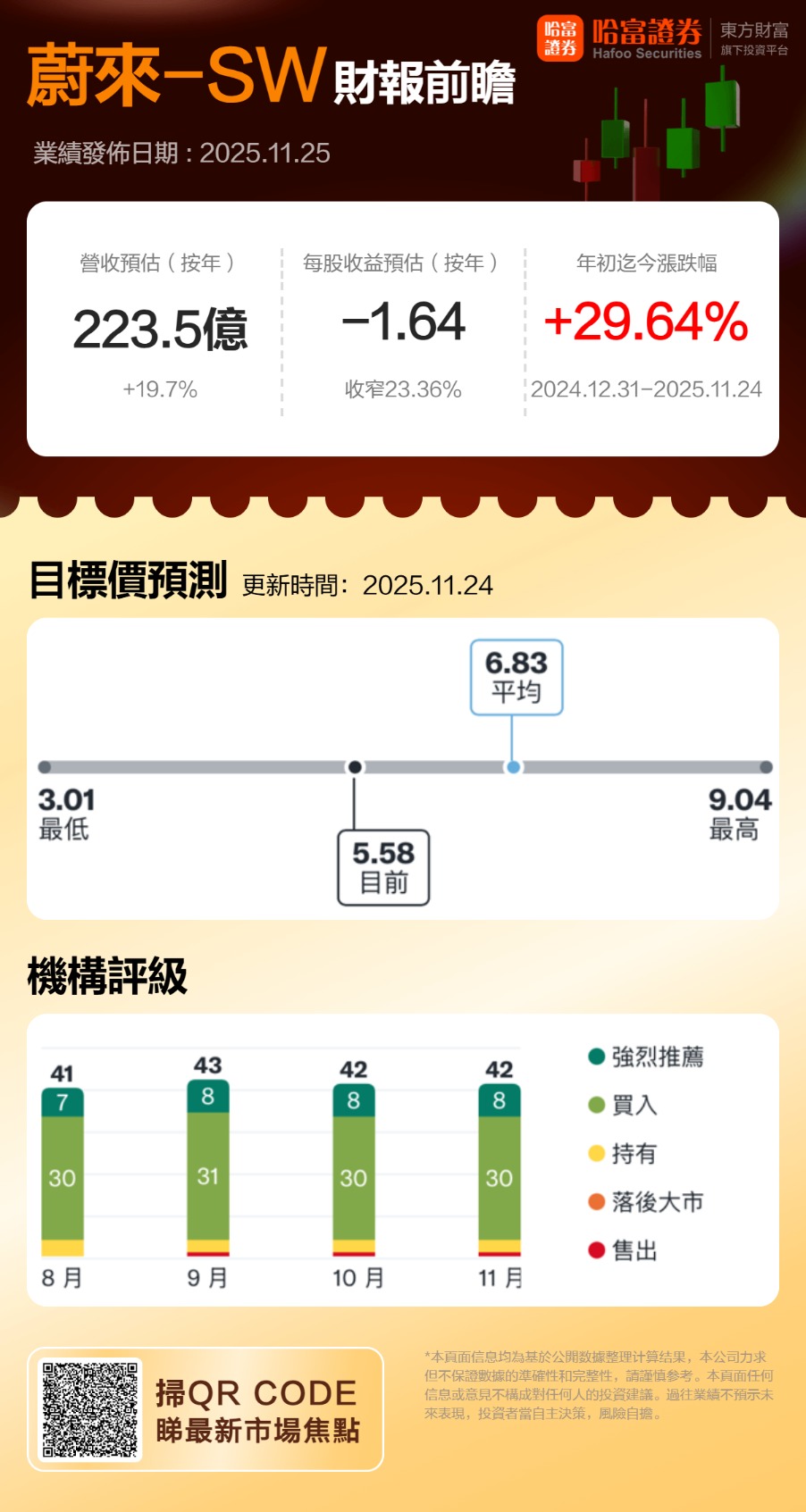 蔚来将于北京时间11月25日发布财报,2025Q3预计实现营收223.5亿元,同比增幅约19.7%;预期每股收益-1.64元,同比亏损收窄23.36%。