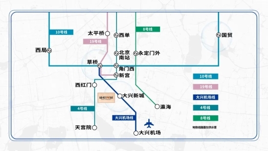 项目坐拥轨道交通核心优势:距大兴新城站约200米,真正实现 “出家门即入地铁”。从该站点出发,向北一站直达草桥站,可换乘10号线快速通达国贸、丽泽商务区,或换19号线抵达金融街等核心区域;向南一站直抵大兴机场,实现 “国门通勤” 无缝对接,尽享 “一站到草桥,换乘通达全城” 的 “一站三环” 通勤便利。